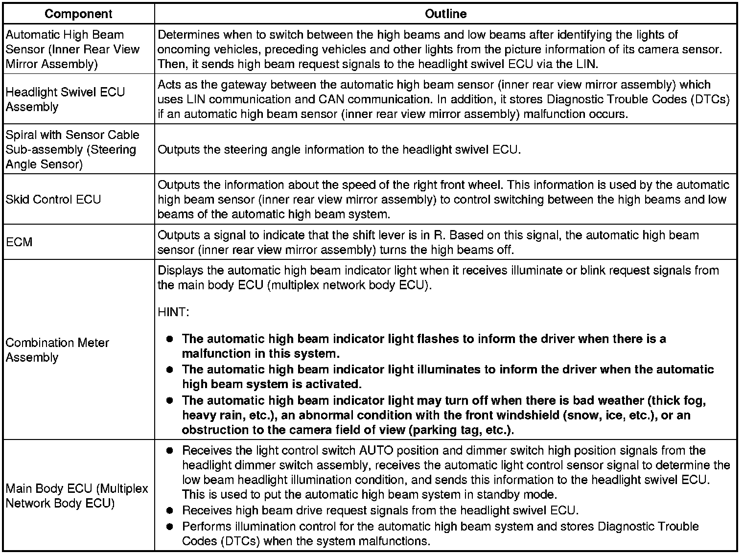 The automatic high beam system monitors the area in front of the vehicle using the camera built into the inner rear view mirror assembly and makes a judgment to change from the low beams to the high beams when the surrounding area is dark (there are no headlights from oncoming vehicles and no taillights from vehicles in front). High beam control limitations: