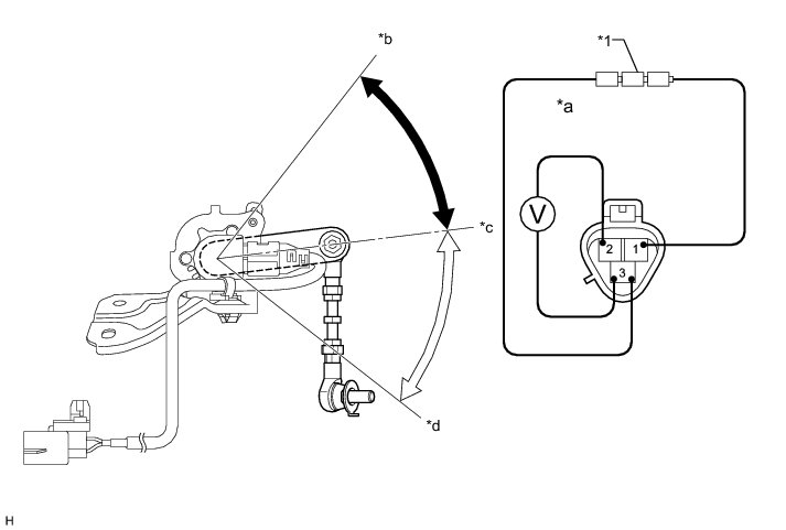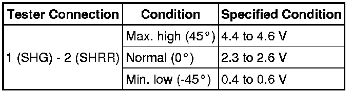(b) Connect the positive (+) end of the batteries to terminal 3 (SHB) of the height control sensor and the negative (-) end of the batteries to terminal 1 (SHG). While slowly moving the sensor link up and down, measure the voltage between terminal 2 (SHRR) and terminal 1 (SHG).