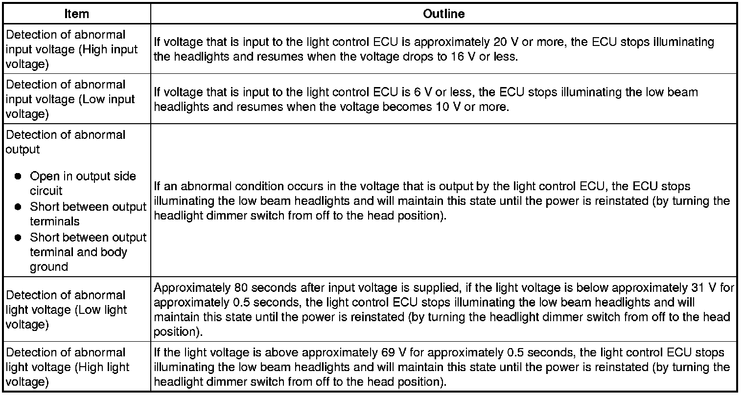 The light control ECU sub-assembly operates in fail-safe mode if an abnormal condition such as those listed below has been detected.