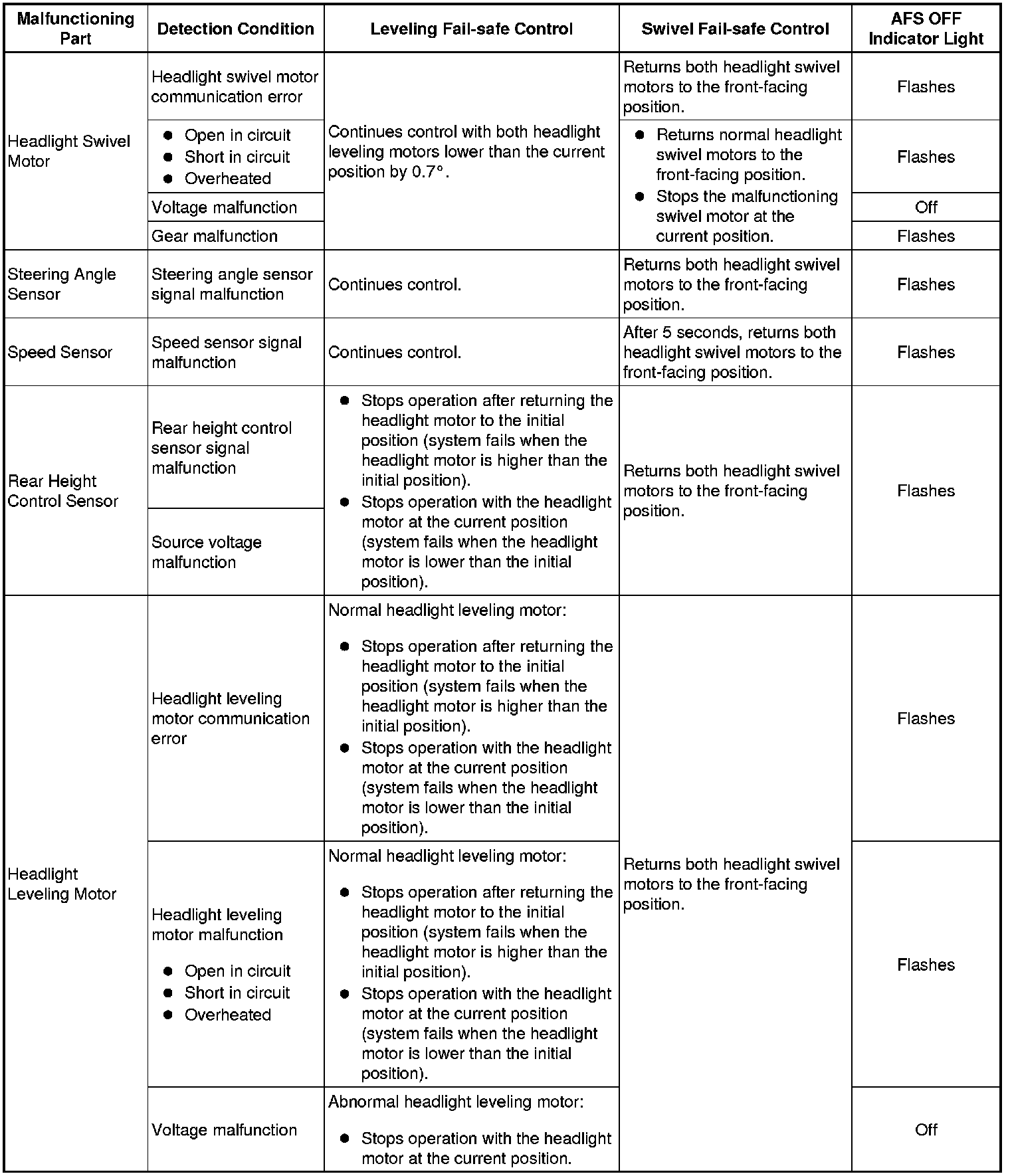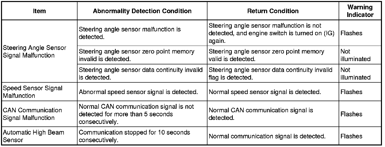 If the headlight swivel ECU detects a malfunction in the automatic headlight beam level control system or intelligent AFS, it will take the actions indicated in the table below.