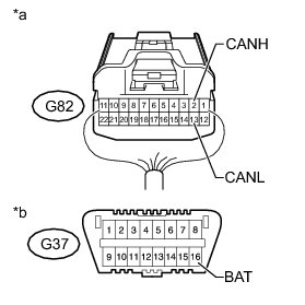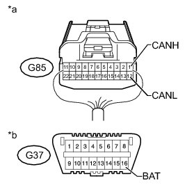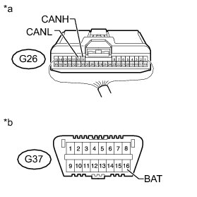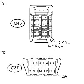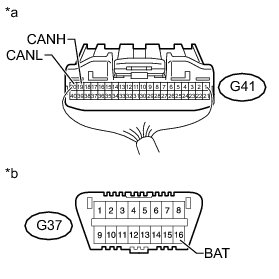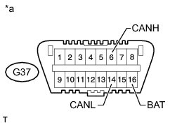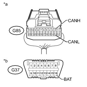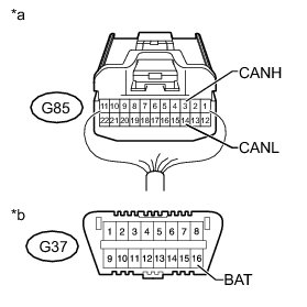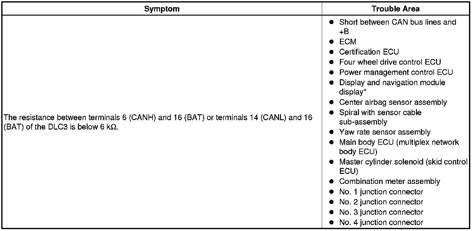 There may be a short circuit between the CAN bus lines and +B when the resistance between terminals 6 (CANH) and 16 (BAT) or terminals 14 (CANL) and 16 (BAT) of the DLC3 is below 6 kOhms.
