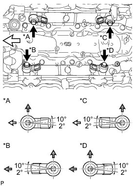 (a) Install the 4 knock sensors with the 4 bolts so that the knock sensors are angled as shown in the illustration.