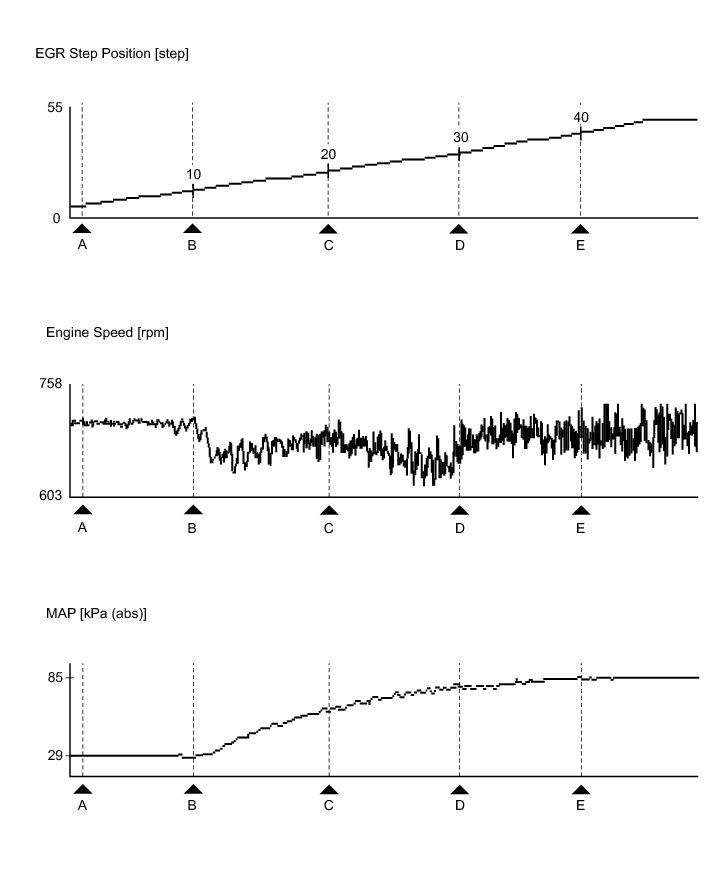 * Usually, when the control value for Control the EGR Step Position is changed from "0 step" to "30 step", the value of MAP increases to a value at least 10 kPa higher than the value of MAP when the control value for Control the EGR Step Position was "0 step", and the engine idles roughly or stalls.
