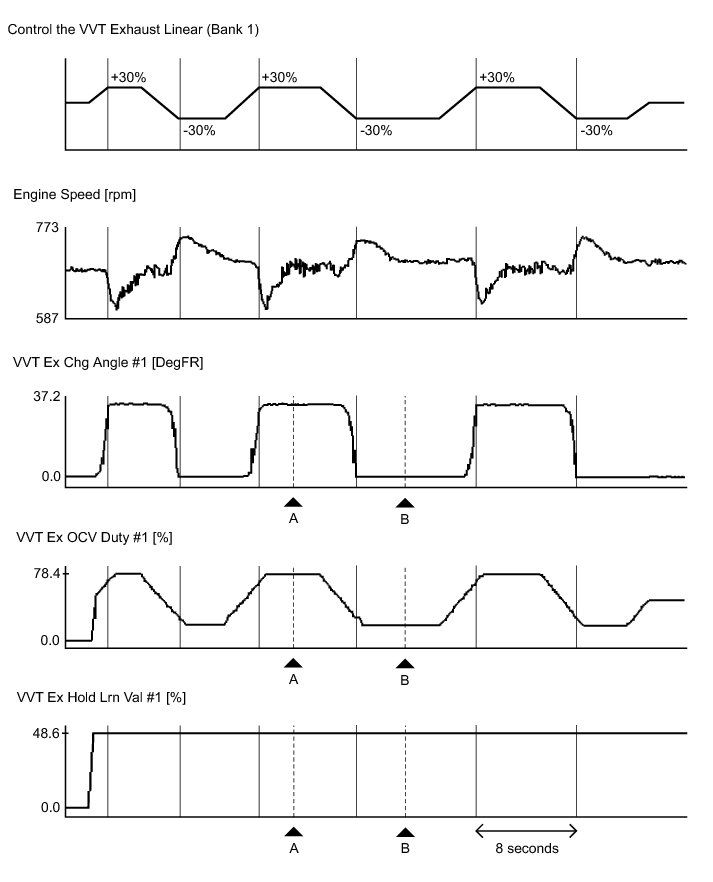 * The sum of the control value for the Control the VVT Exhaust Linear Active Test and the value of VVT Ex Hold Lrn Val is approximately equal to the value of VVT Ex OCV Duty.
