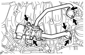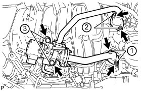 (c) Temporarily install the EGR valve assembly to the intake manifold with the 2 bolts and 4 nuts.
