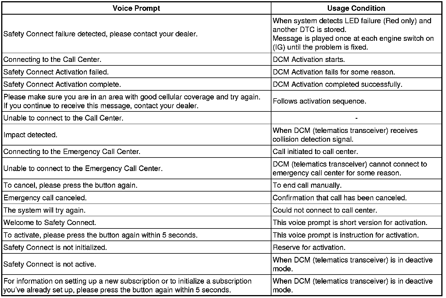 The system plays back the following voice prompts in the situations shown.