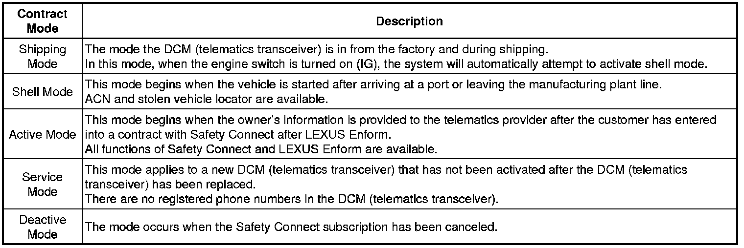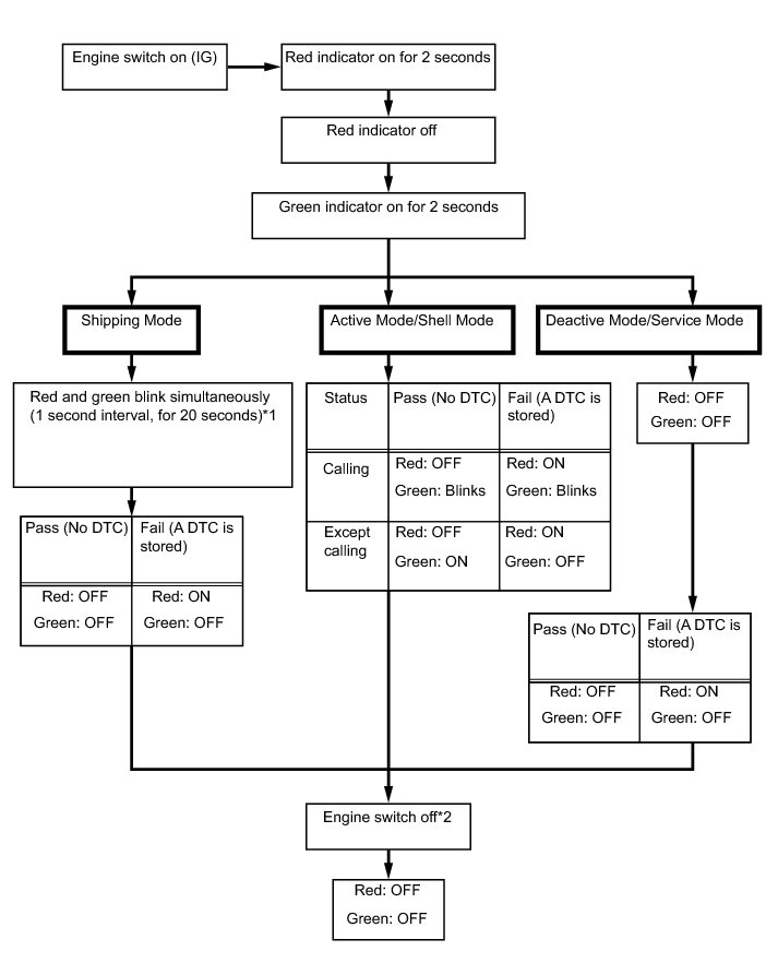 Every time after the engine switch is turned on (IG), the DCM (telematics transceiver) enters a self-check mode. The manual (SOS) switch red indicator will illuminate for 2 seconds, and then turn off. Then the manual (SOS) switch green indicator will illuminate and stay on throughout normal operation. The following chart indicates the possible scenarios.