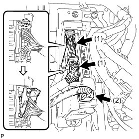 (b) Detach the 2 claws and disconnect the 2 connectors labeled (1) as shown in the illustration.