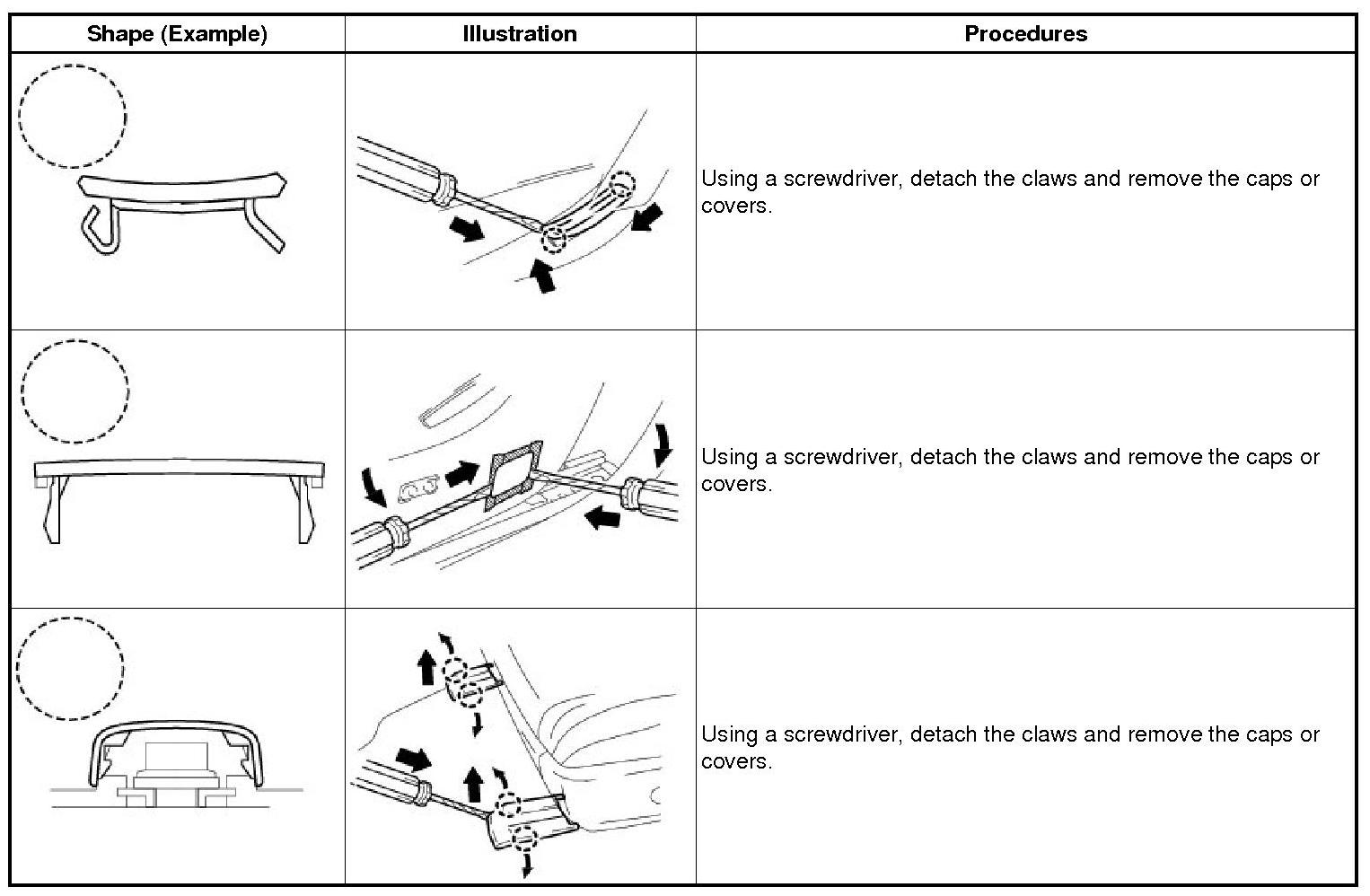 (1) The removal and installation methods of typical claws used for vehicle body parts are shown in the table below.