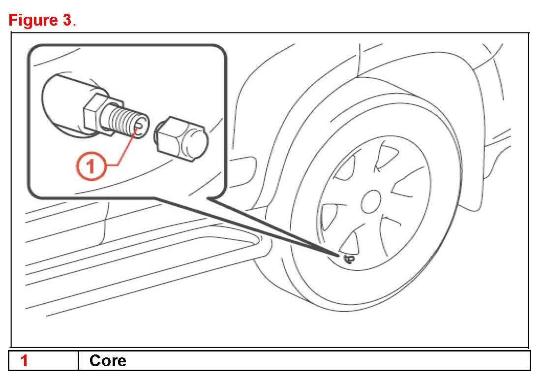 3. Press or remove the valve core to reduce the tire inflation pressure rapidly by 6 psi (0.4 kgf/cm2, 40kPa), or more, within 30 seconds.