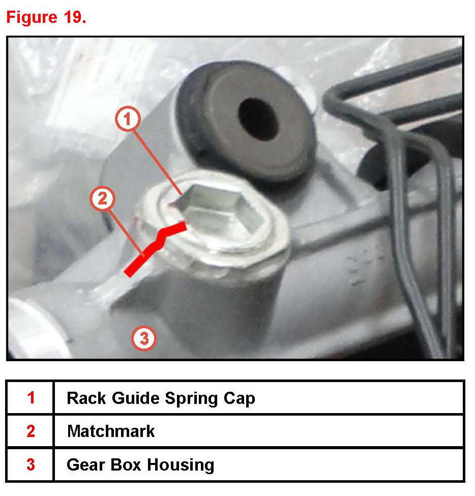 4. Put matchmarks on the rack guide spring cap and gear box to aid in reinstallation.