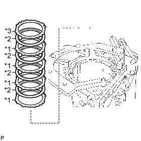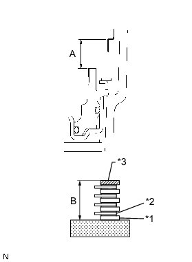 (b) Assemble the 4 plates, 4 discs and flange (thickness: 2.15 to 2.25 mm (0.0846 to 0.0886 in.)) as shown in the illustration, and then, using a vernier caliper, measure distance B in the illustration at both ends across the diameter and calculate the average.