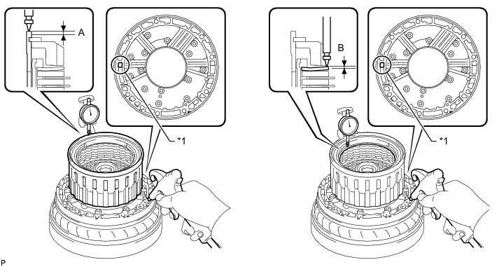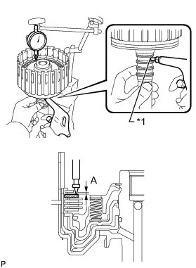 (c) Using a dial indicator, measure the moving distance (A) of the clutch flange at both ends across the diameter while applying compressed air (196 kPa, 2.0 kgf/cm2, 28 psi) into the oil hole as shown in the illustration.