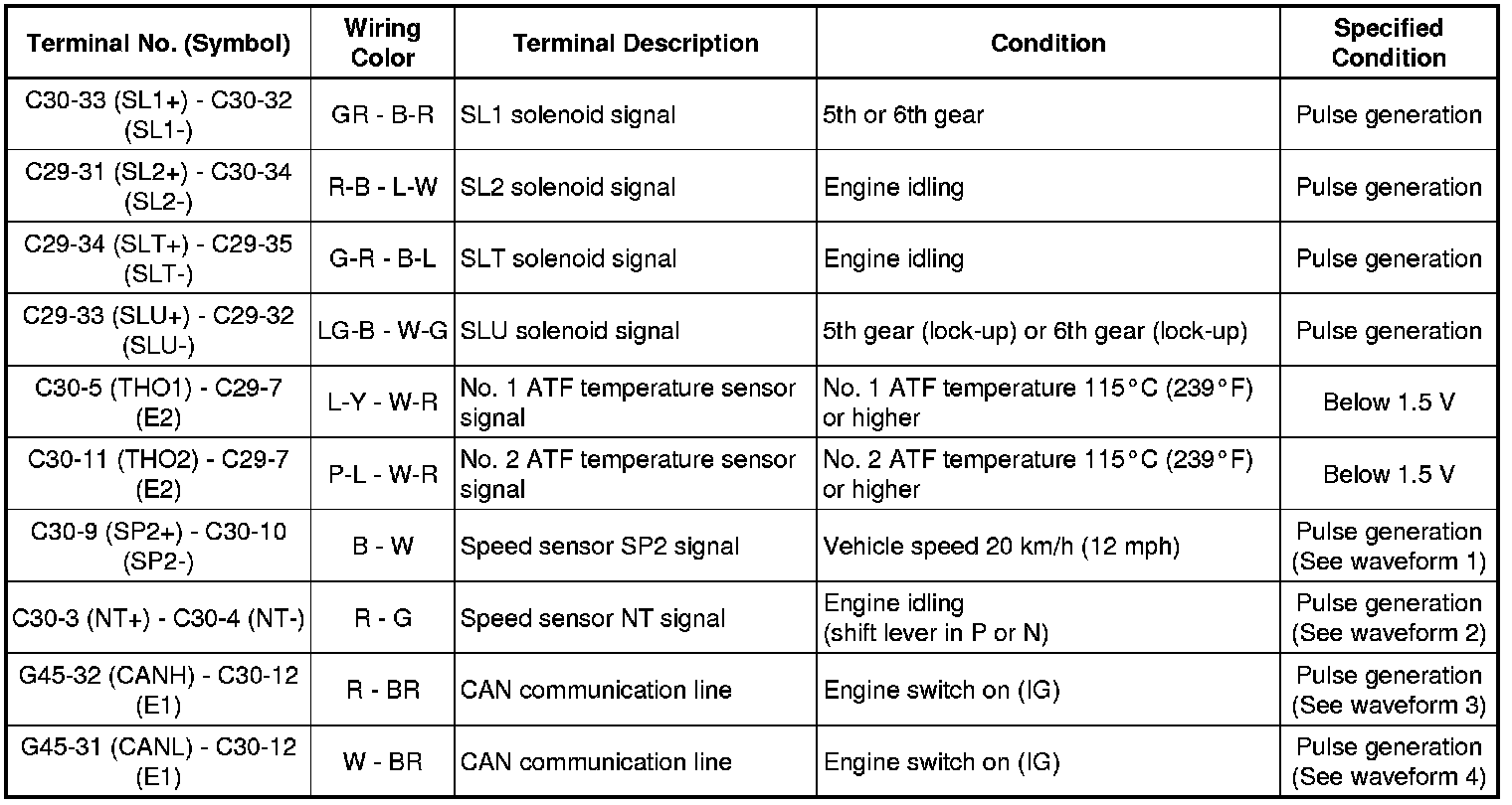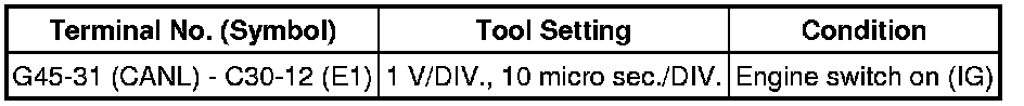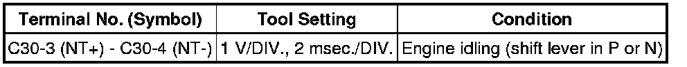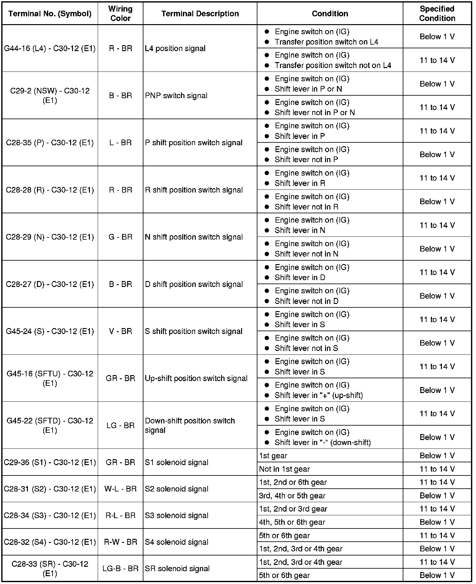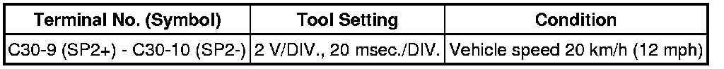 In the table, first follow the information under "Condition". Look under "Terminal No. (Symbol)" for the terminals to inspect. The standard voltage between the terminals is shown under "Specified Condition".