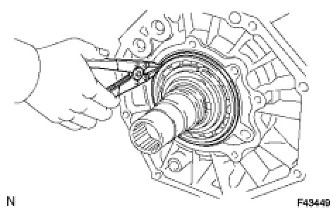 If the removed extension housing is reused, be sure to perform the following before reinstalling it: 1) using a knife, cut off any old seal packing on the housing contact surface, 2) clean off any remaining old seal packing from the housing contact surface, and 3) reapply seal packing to the housing.