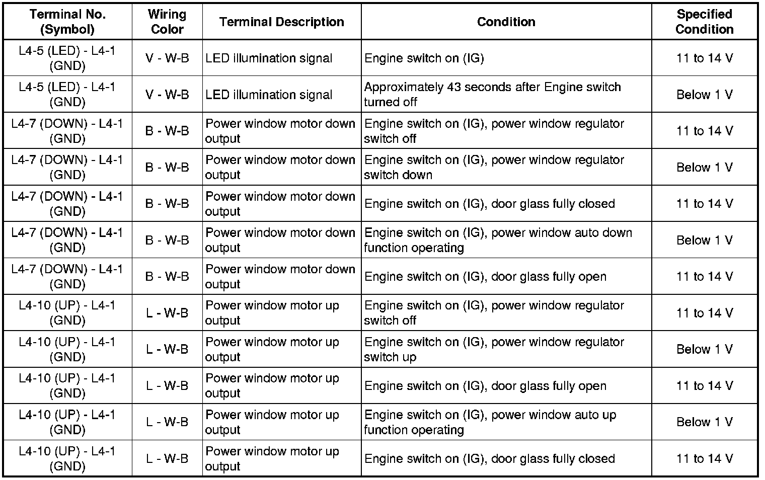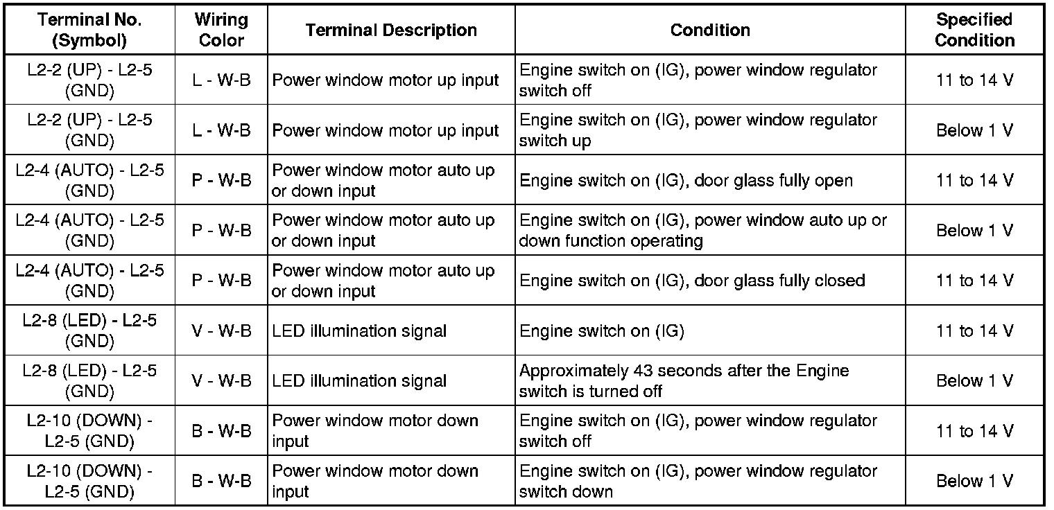 If the result is not as specified, the power window regulator switch may have a malfunction.