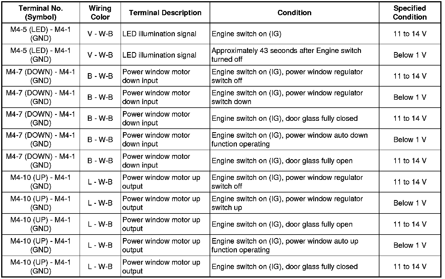 If the result is not as specified, the rear power window regulator motor may have a malfunction.