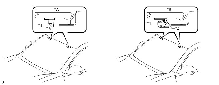 The stoppers are located on the windshield glass sub-assembly as shown in the illustration. Be careful not to damage the windshield glass when removing the stoppers.