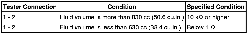 When the fluid volume is between 630 and 830 cc (38.4 cu.in. and 50.6 cu.in.) the level warning switch may be on or off.