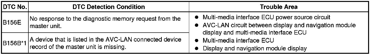 When an AVC-LAN communication error occurs between the display and navigation module display and multi-media interface ECU, these DTCs will be stored.