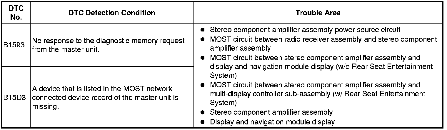 When a MOST communication error occurs between the display and navigation module display and stereo component amplifier assembly, these DTCs will be stored.
