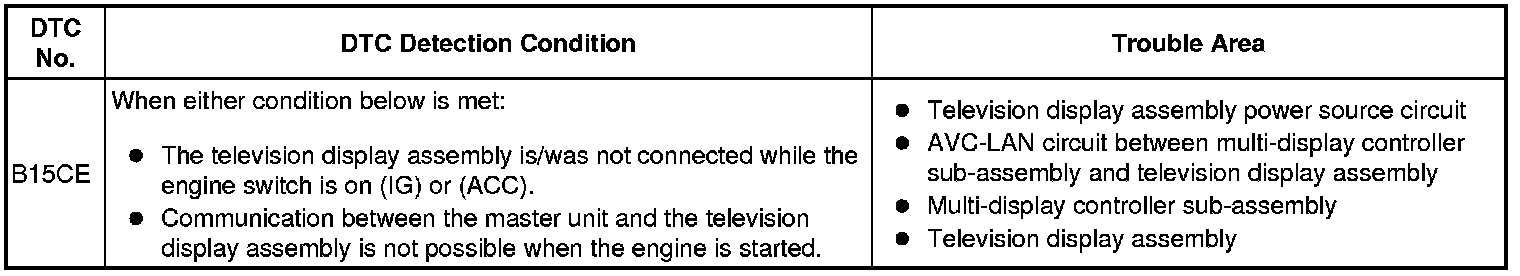 This DTC will be stored when an AVC-LAN communication error occurs between the multi-display controller sub-assembly and television display assembly.