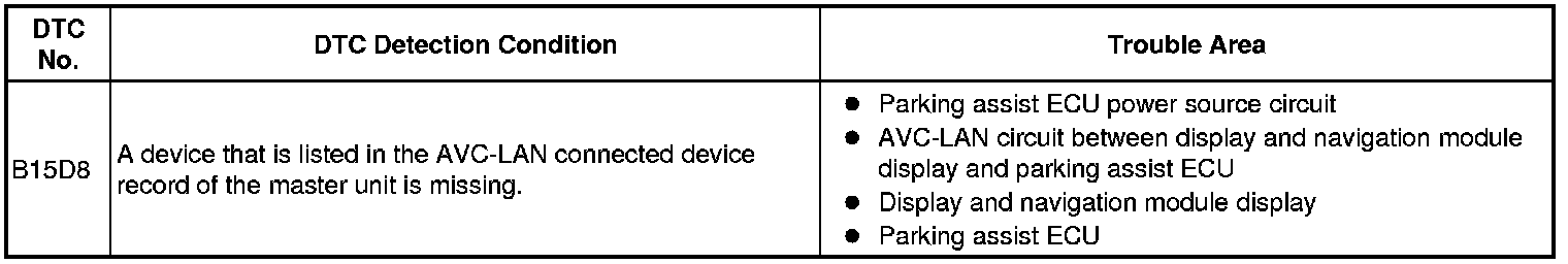 When an AVC-LAN communication error occurs between the display and navigation module display and parking assist ECU, this DTC will be stored.