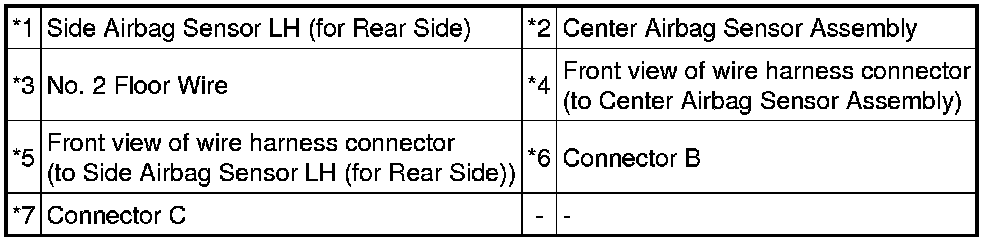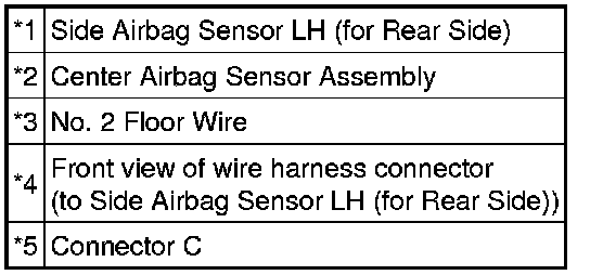 (c) Check that the connectors are properly connected to the center airbag sensor assembly, side airbag sensor LH (for rear side), rear airbag sensor LH and side airbag sensor LH (for front side). Also check that the connectors that link the No. 2 floor wire and front door wire LH are properly connected.