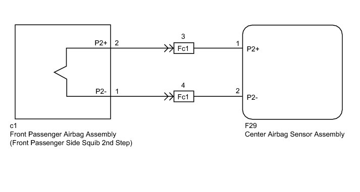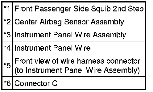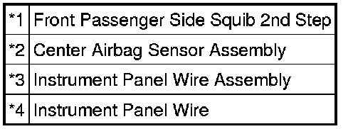 The front passenger side squib 2nd step circuit consists of the center airbag sensor assembly and front passenger airbag assembly.