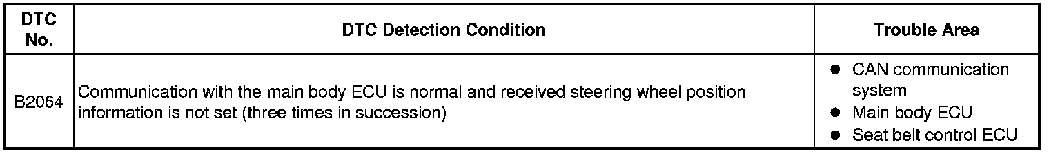 DTC B2064 is stored when the CAN communication frame with the main body ECU is normal and communication is available, but the steering wheel position information is not set or varies.