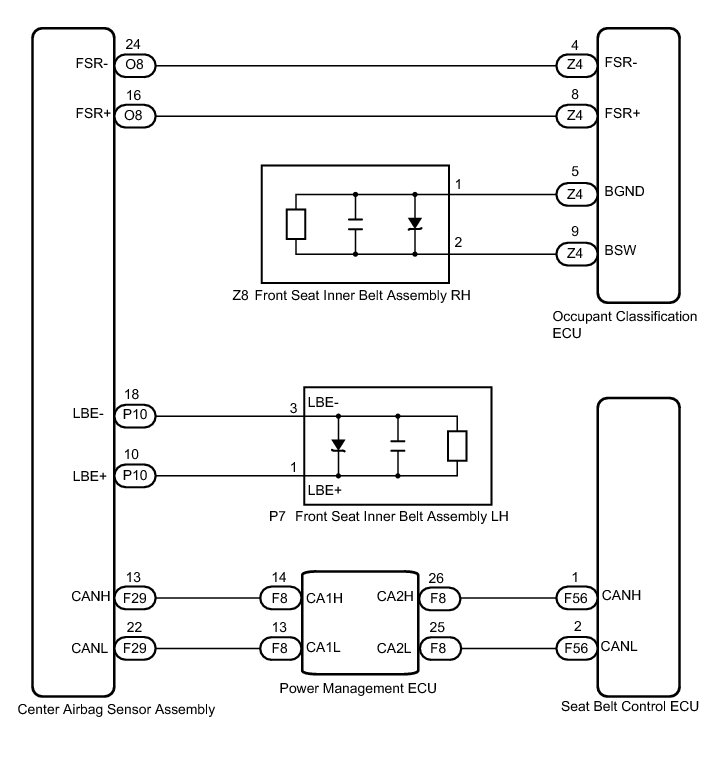 These DTCs are stored when a malfunction is detected in the driver side buckle switch circuit or passenger side buckle switch circuit.