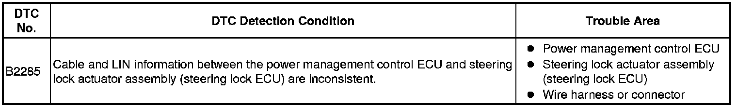 This DTC is stored when serial communication signals and LIN communication signals in the circuit between the power management control ECU and steering lock actuator assembly (steering lock ECU) are inconsistent.