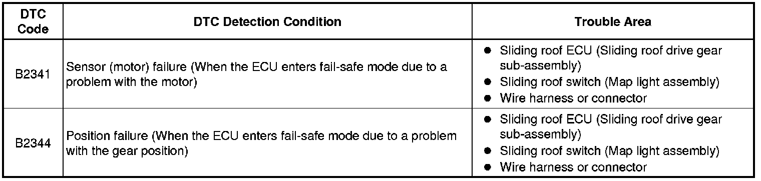 When the sliding roof ECU (sliding roof drive gear sub-assembly) detects a motor malfunction and the sliding roof operation is stopped, DTC B2341 is output.
