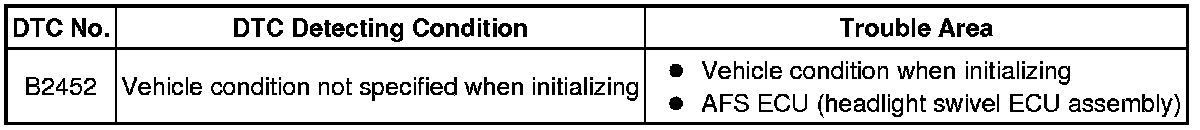 If the AFS ECU (headlight swivel ECU assembly) stores B2452 even though the ECU has been initialized as instructed, there may be a malfunction in the AFS ECU (headlight swivel ECU assembly).