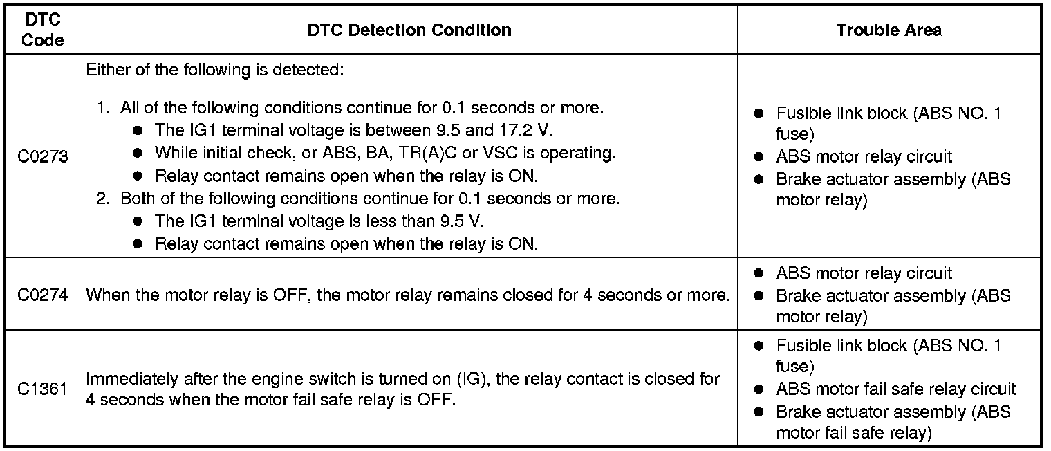 BRAKE CONTROL / DYNAMIC CONTROL SYSTEMS: VEHICLE STABILITY CONTROL SYSTEM: C0273, C0274, C1361: Open in ABS Motor Relay Circuit