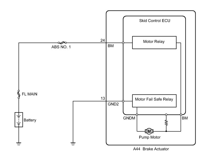 The ABS motor relay supplies power to the ABS pump motor. While the ABS is activated, the ECU turns the motor relay on and operates the ABS pump motor.