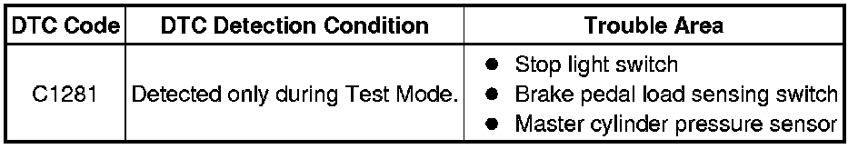 DTC C1281 will be cleared when the master cylinder pressure sensor sends a master cylinder pressure signal or when Test Mode ends. DTC C1281 is output only in Test Mode.