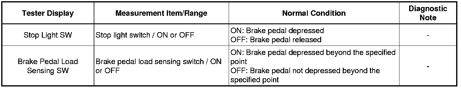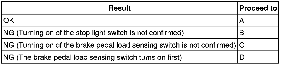 First the stop light switch should turn ON, and then the brake pedal load sensing switch should turn ON.