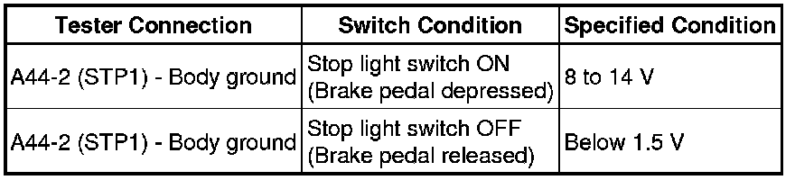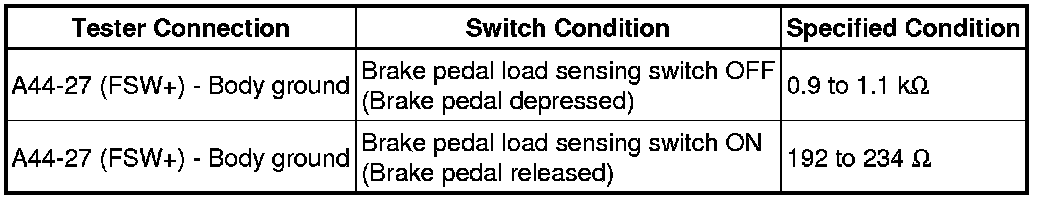 (e) Slowly depress the brake pedal, and check when the stop light switch and brake pedal load sensing switch turn ON.
