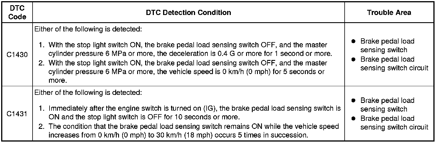 BRAKE CONTROL / DYNAMIC CONTROL SYSTEMS: VEHICLE STABILITY CONTROL SYSTEM: C1430, C1431: Brake Pedal Load Sensing Switch OFF Stuck Malfunction