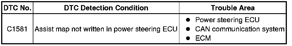 The power steering ECU stores this DTC when it determines that the assist map is not written in the ECU.