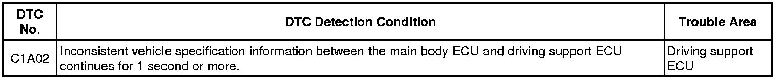 DTC C1A02 is stored when the driving support ECU receives the vehicle specification information from the main body ECU and combination meter but cannot record it.