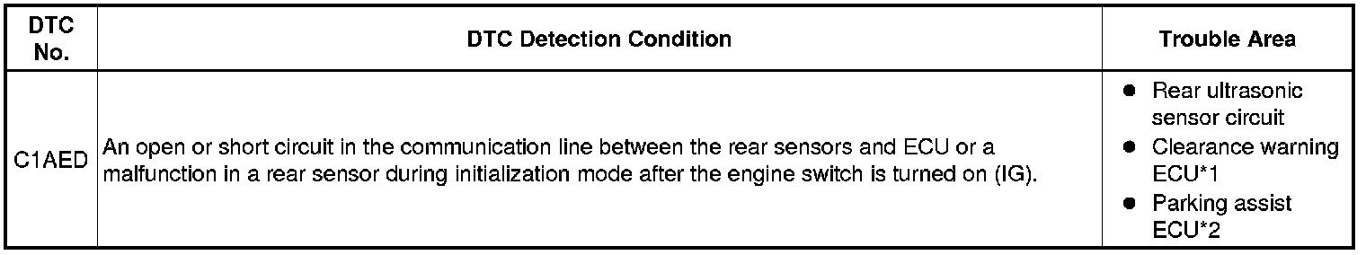 This DTC is stored when there is an open or short circuit in the communication line between the rear sensors and the ECU, or when there is a malfunction in a rear sensor.