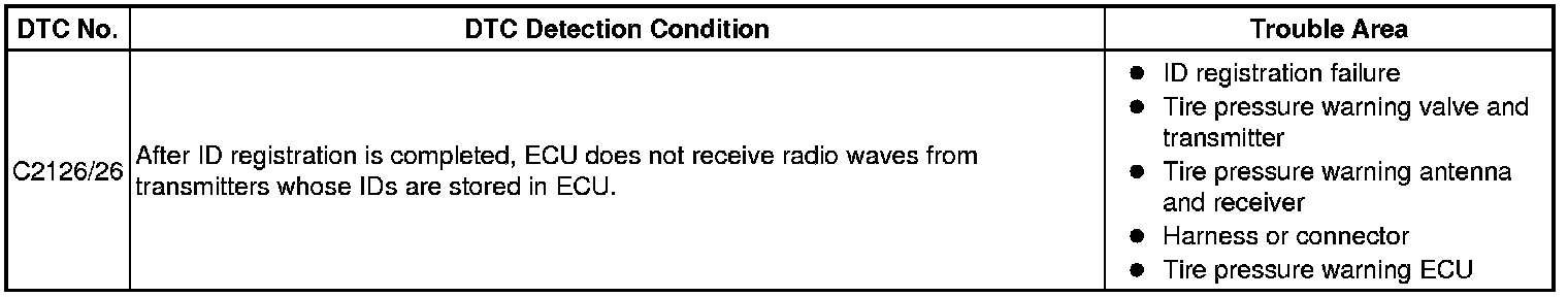 If the IDs stored in the tire pressure warning ECU differ from the transmitter IDs, DTC C2126/26 will be set. Check that the IDs in the ECU are the same as the transmitter IDs.