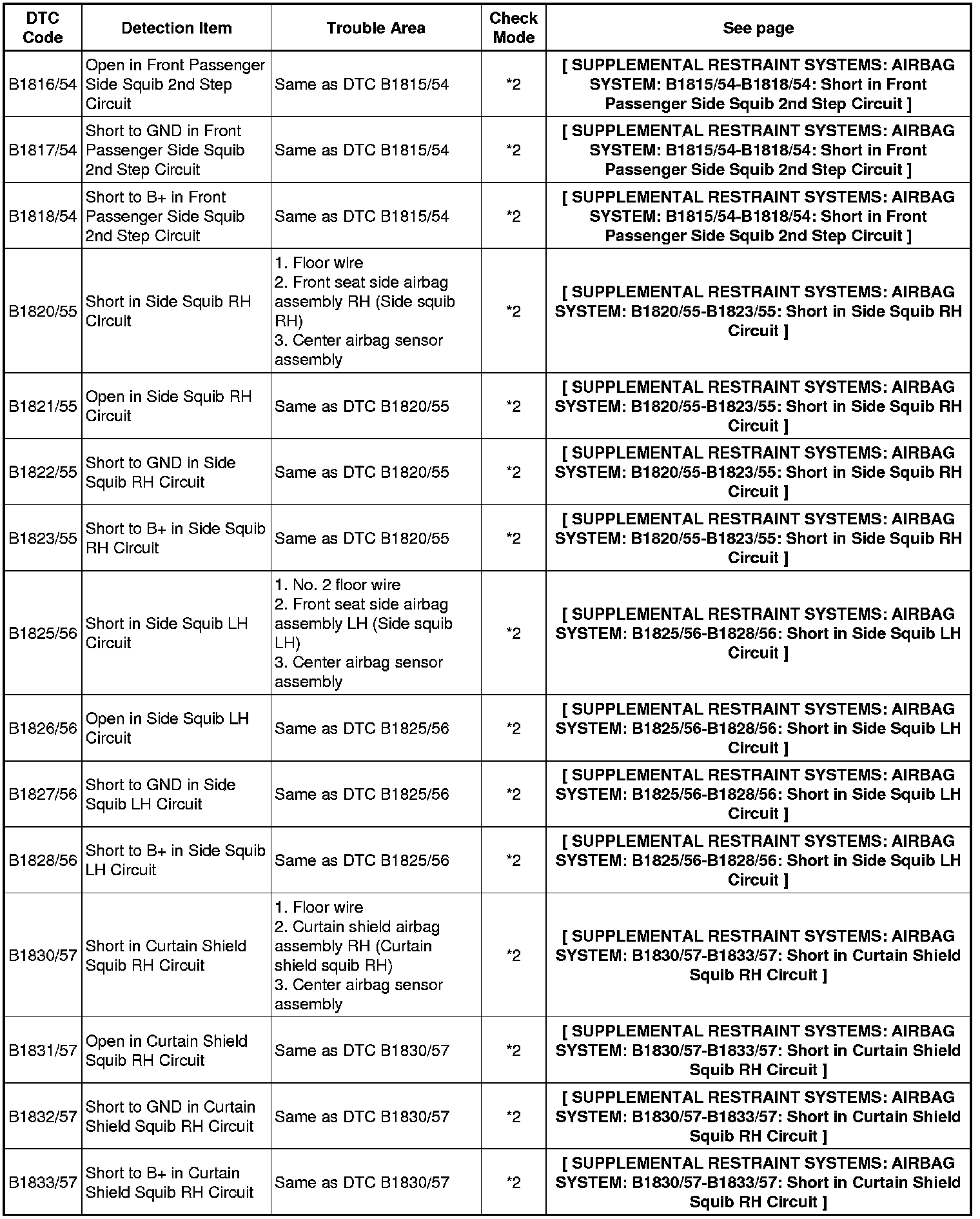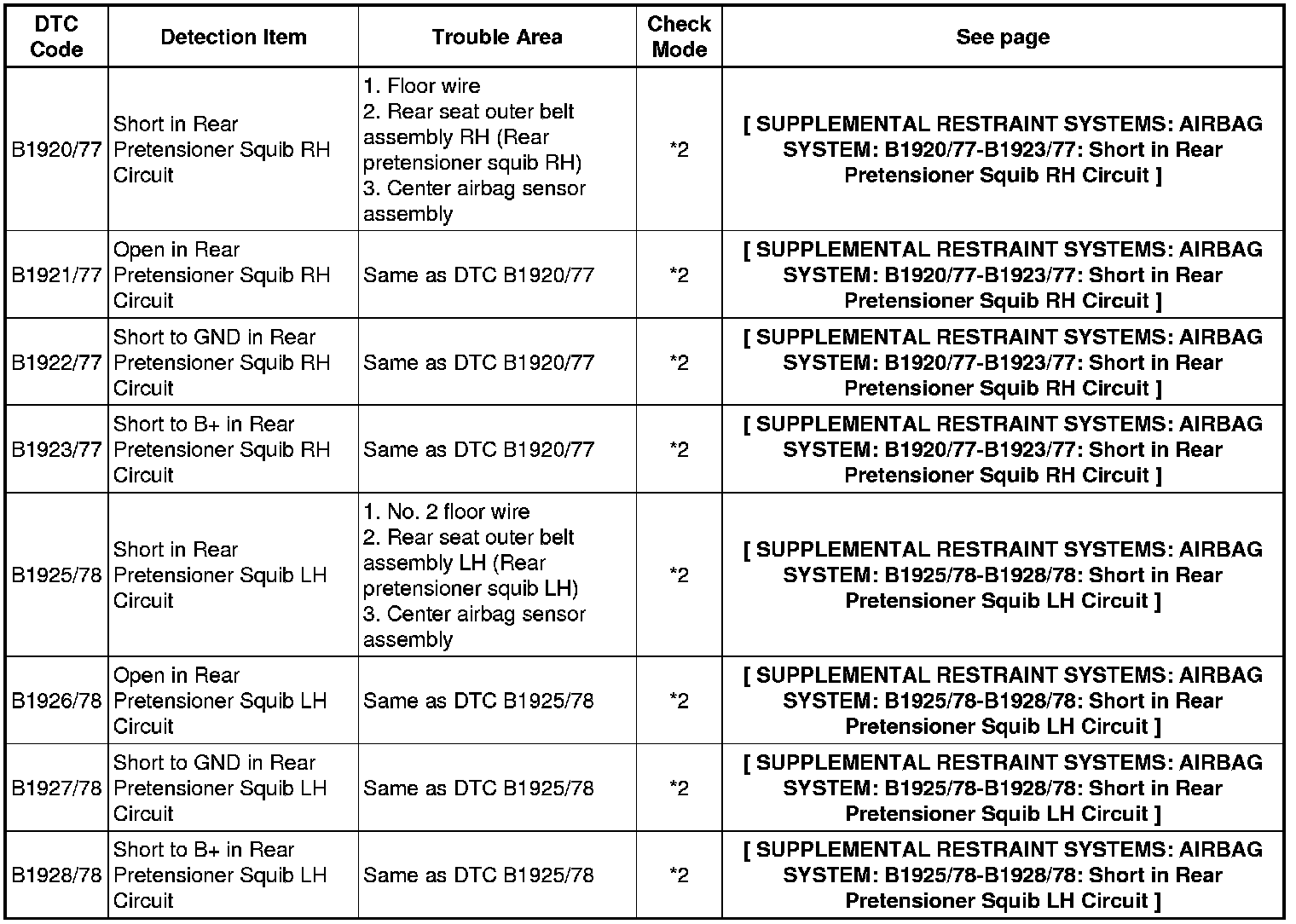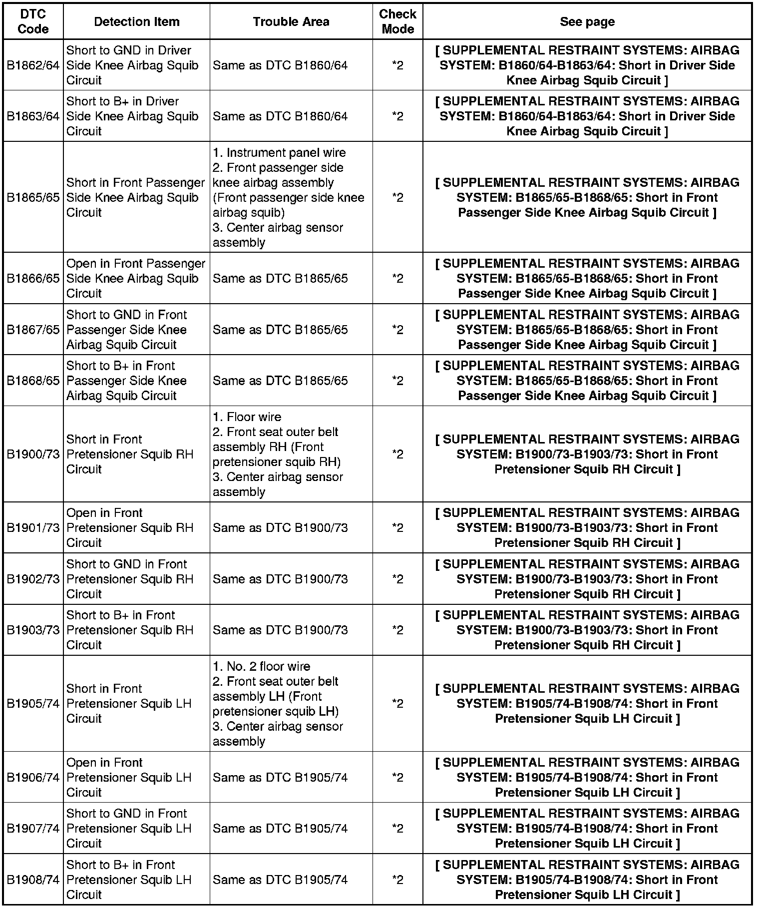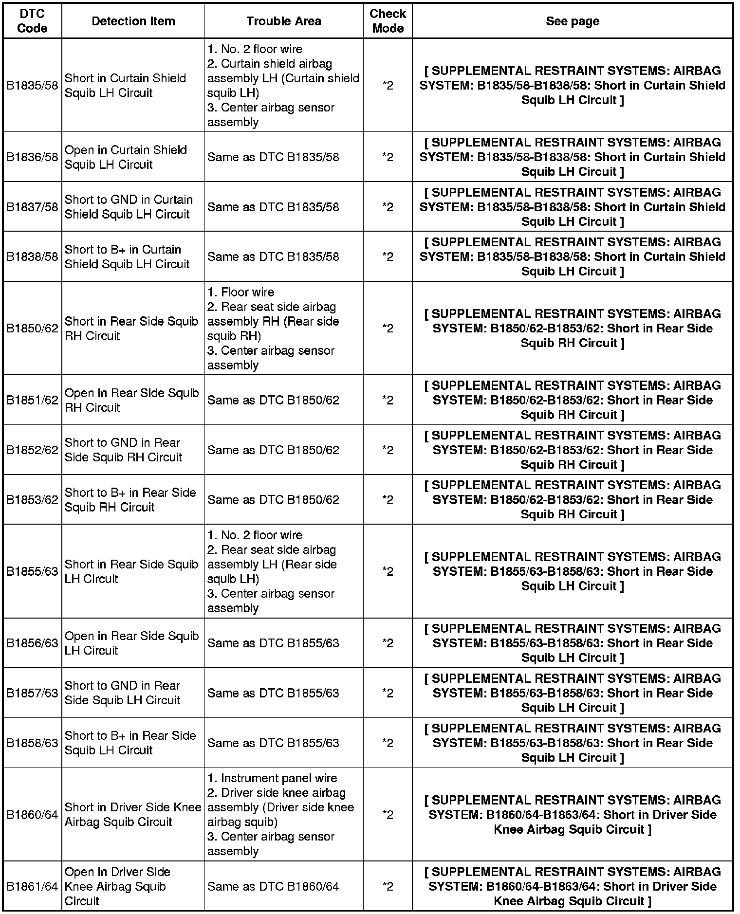 * In the case of any malfunction concerning an open circuit, short to ground, or short to B+ due to a squib, other trouble codes may not be detected. In this case, repair the malfunction currently indicated and then perform malfunction diagnosis again.