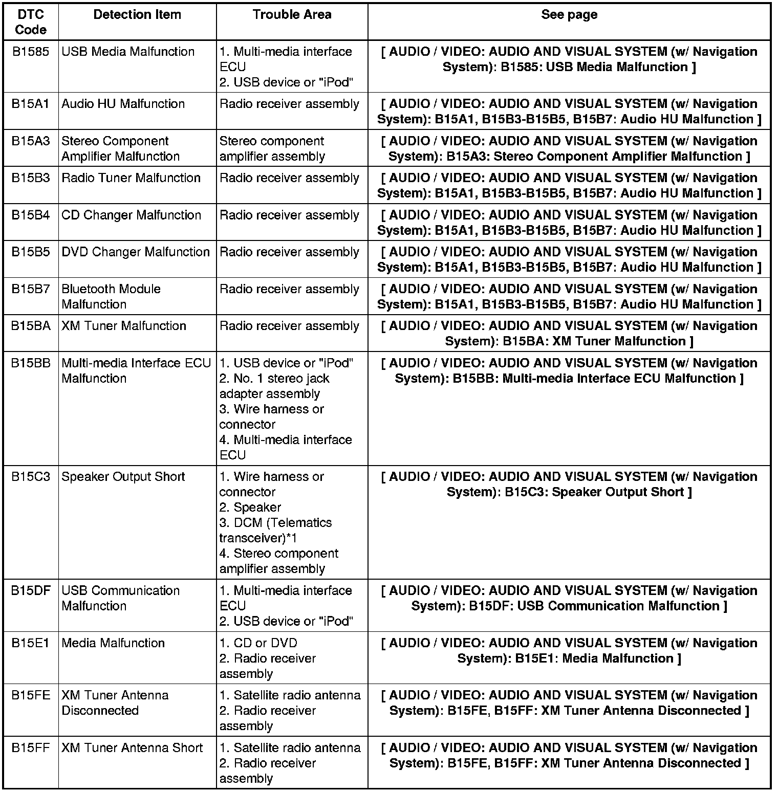 AUDIO / VIDEO: AUDIO AND VISUAL SYSTEM (w/ Navigation System): DIAGNOSTIC TROUBLE CODE CHART