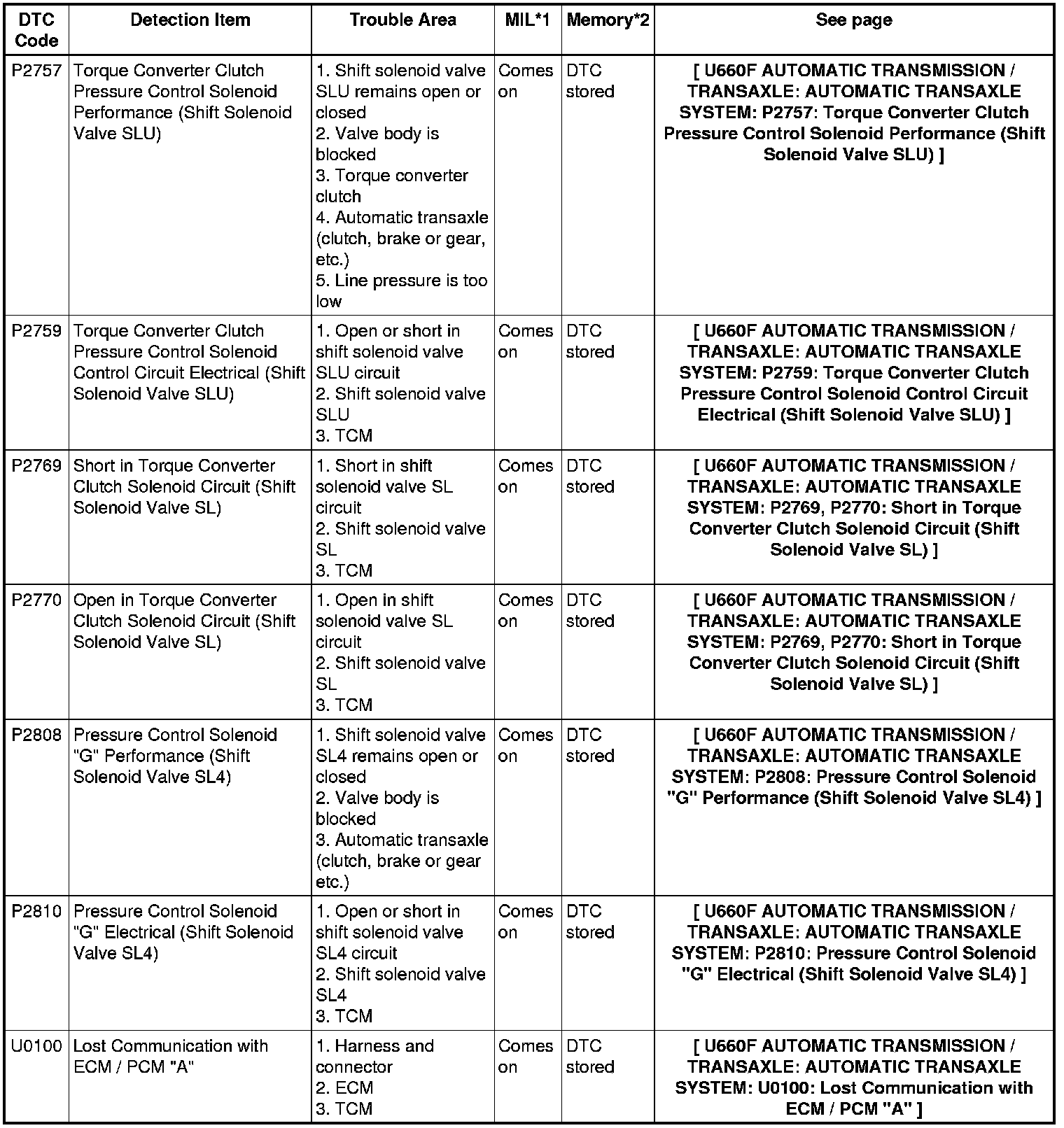 * *2: "DTC stored" means the TCM memorizes the trouble code if the TCM detects the DTC detection condition.