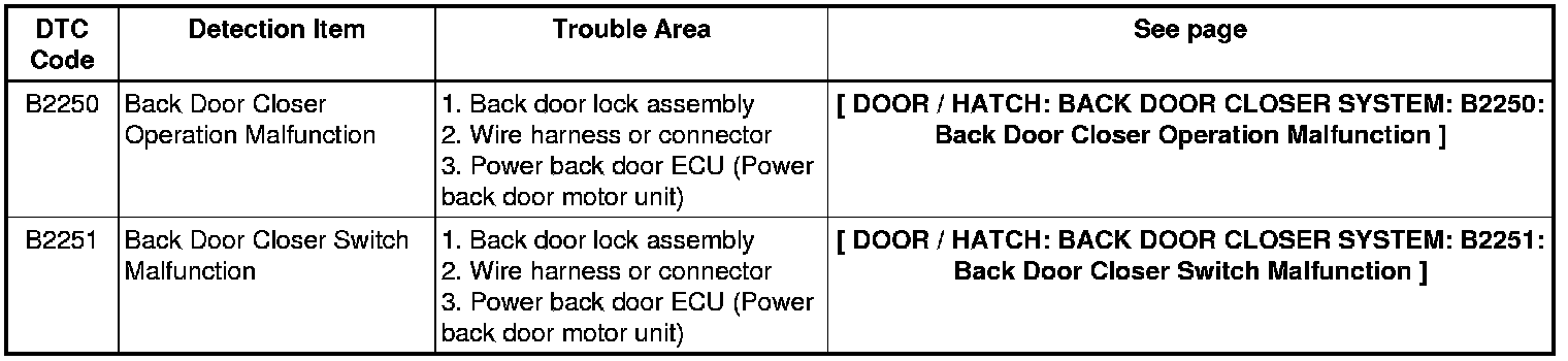 DOOR / HATCH: BACK DOOR CLOSER SYSTEM: DIAGNOSTIC TROUBLE CODE CHART