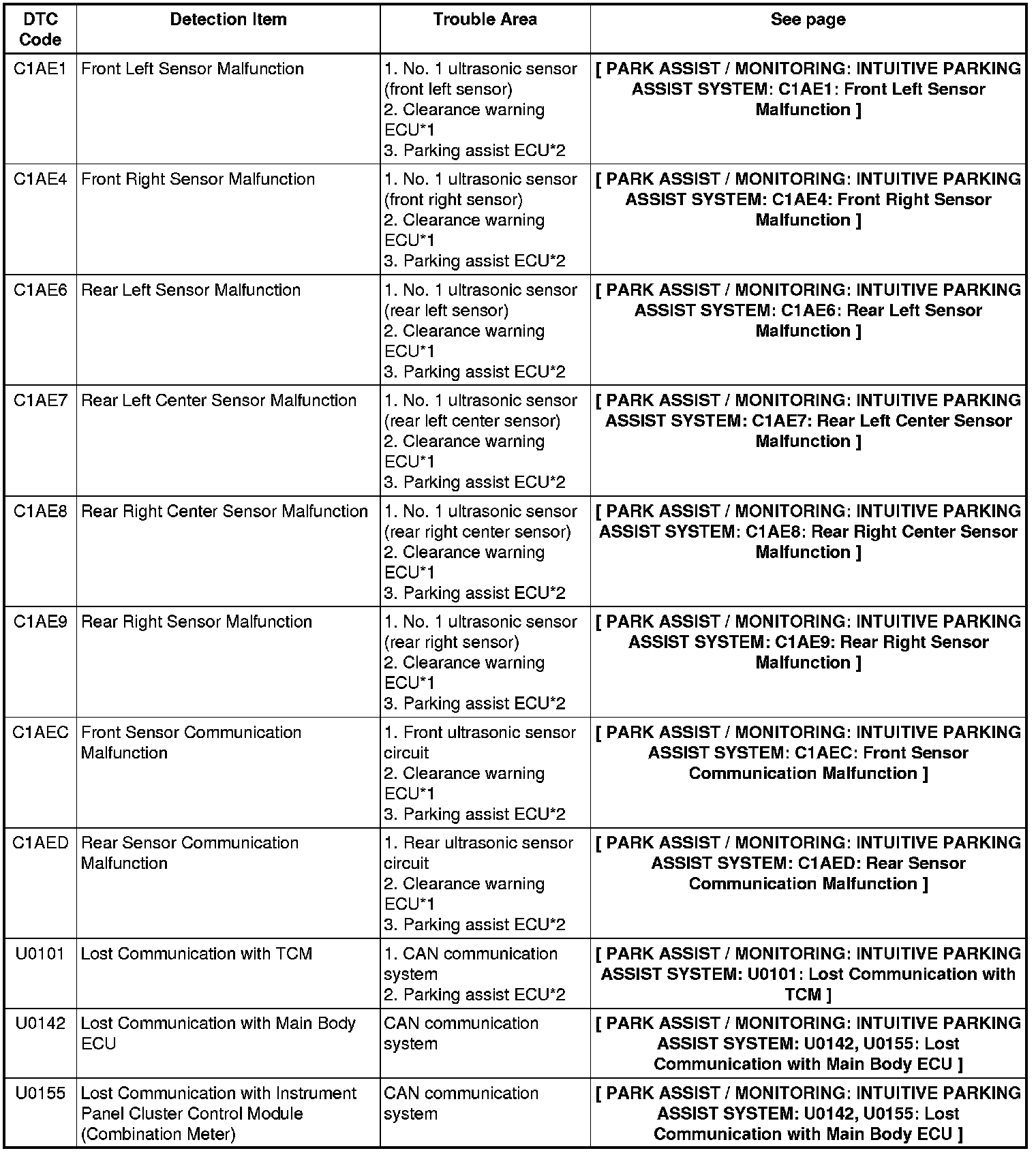 PARK ASSIST / MONITORING: INTUITIVE PARKING ASSIST SYSTEM: DIAGNOSTIC TROUBLE CODE CHART
