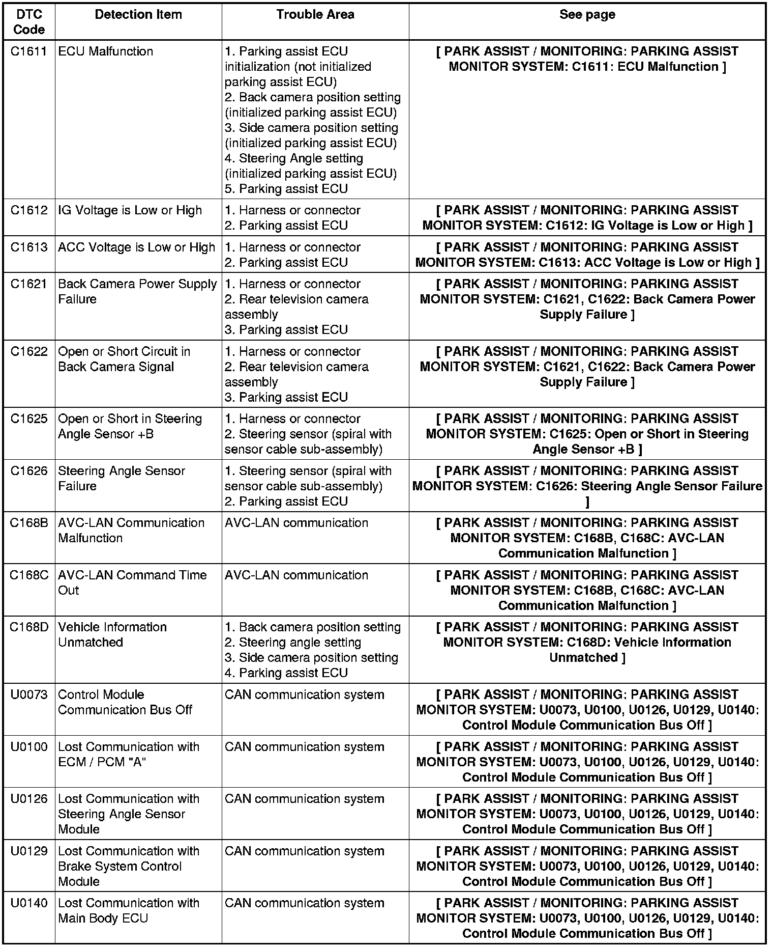 PARK ASSIST / MONITORING: PARKING ASSIST MONITOR SYSTEM: DIAGNOSTIC TROUBLE CODE CHART